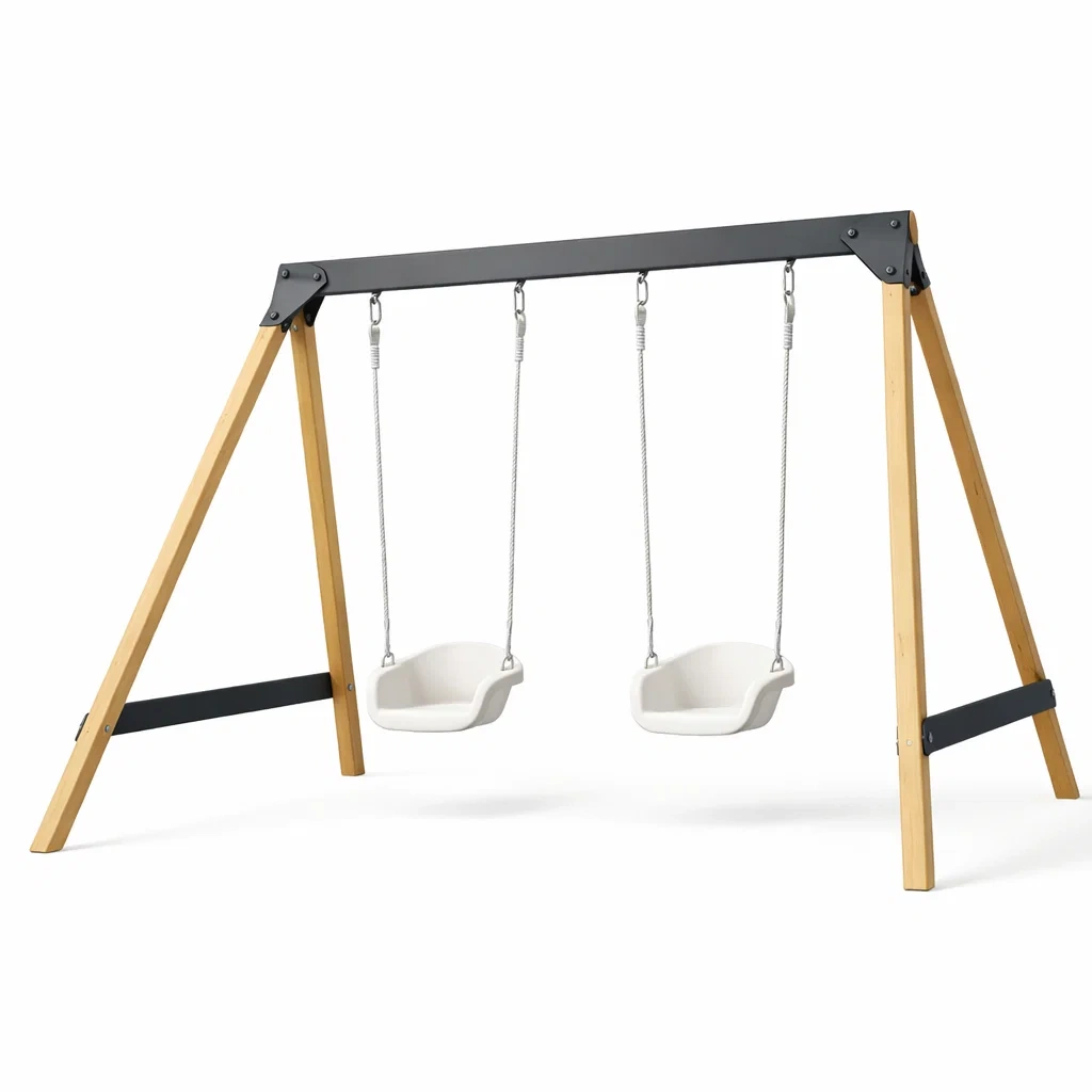 Ensemble de balançoires en bois et métal avec sièges en plastique blanc
