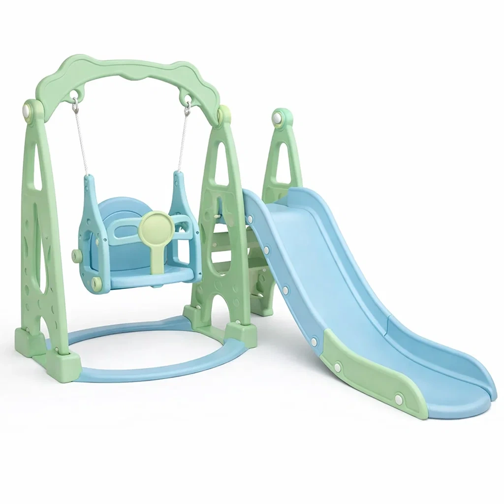 Structure de jeux pour enfants avec balançoire et toboggan en plastique vert et bleu
