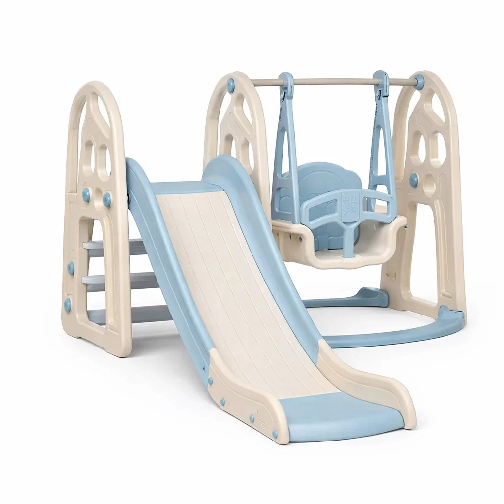 Structure de jeux pour enfants avec toboggan et balançoire en plastique pe bleu et beige