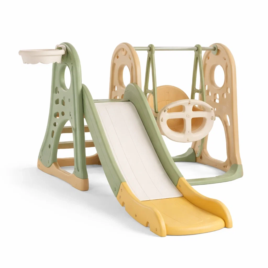 Structure de jeux pour enfants avec toboggan et balançoire en plastique vert et beige