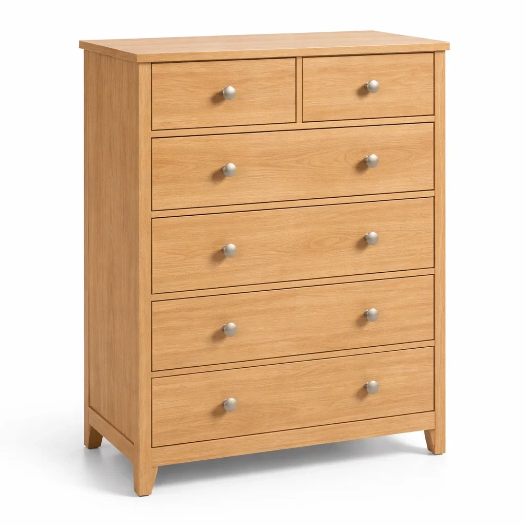 La commode est fabriquée en chêne massif avec une finition en chêne clair. Elle dispose de 6 tiroirs spacieux avec des poignées en métal. Dimensions : hauteur 120 cm, largeur 80 cm, profondeur 40 cm. Poids net : 30 kg.