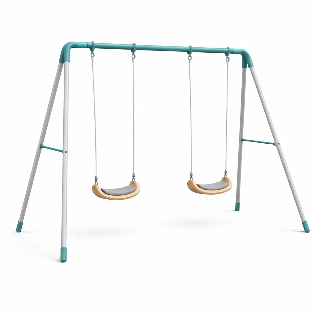 Ce portique à balançoire double est conçu pour l'extérieur avec une structure en acier et des sièges en bois stratifié. Dimensions : 200 cm de longueur, 170 cm de largeur et 180 cm de hauteur.