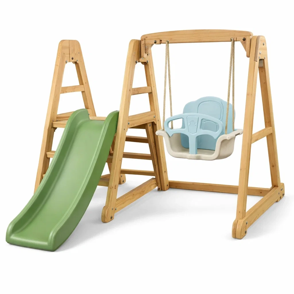Matériau: Structure en bois, toboggan en polyéthylène, siège de balançoire en polypropylène.